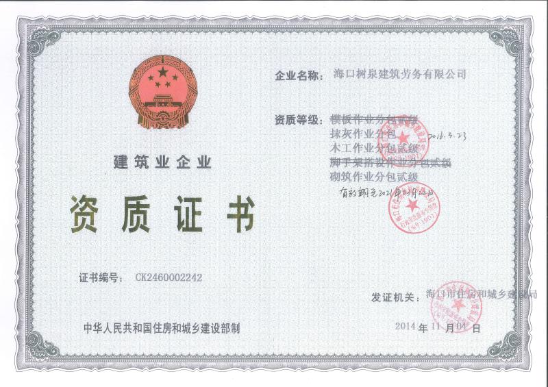 ??跇淙ㄖ趧沼邢薰境闪⒂?011年,公司位于???,其前身是一家專業建筑施工隊,自2004年即開始在海南從事建筑勞務施工。自成立至今,公司已經擁有一支科學管理、質量過硬、能打硬仗,搶工期的專業隊伍。能獨立承擔大中型工業與民用建筑 、室內外裝修、各類機電設備安裝工程。代表工程有海口濱海華庭、三亞時代海岸T01/02/04/05棟高層、合肥東?;▓@二期、陵水富力灣B區高層、三亞金中海(酒店)、瓊海大印經典花園、??诃h球海景大酒店(四星級酒店,在建中)、陵水珍珠大廈(五星酒店)、??谌f達廣場、美蘭機場二期。